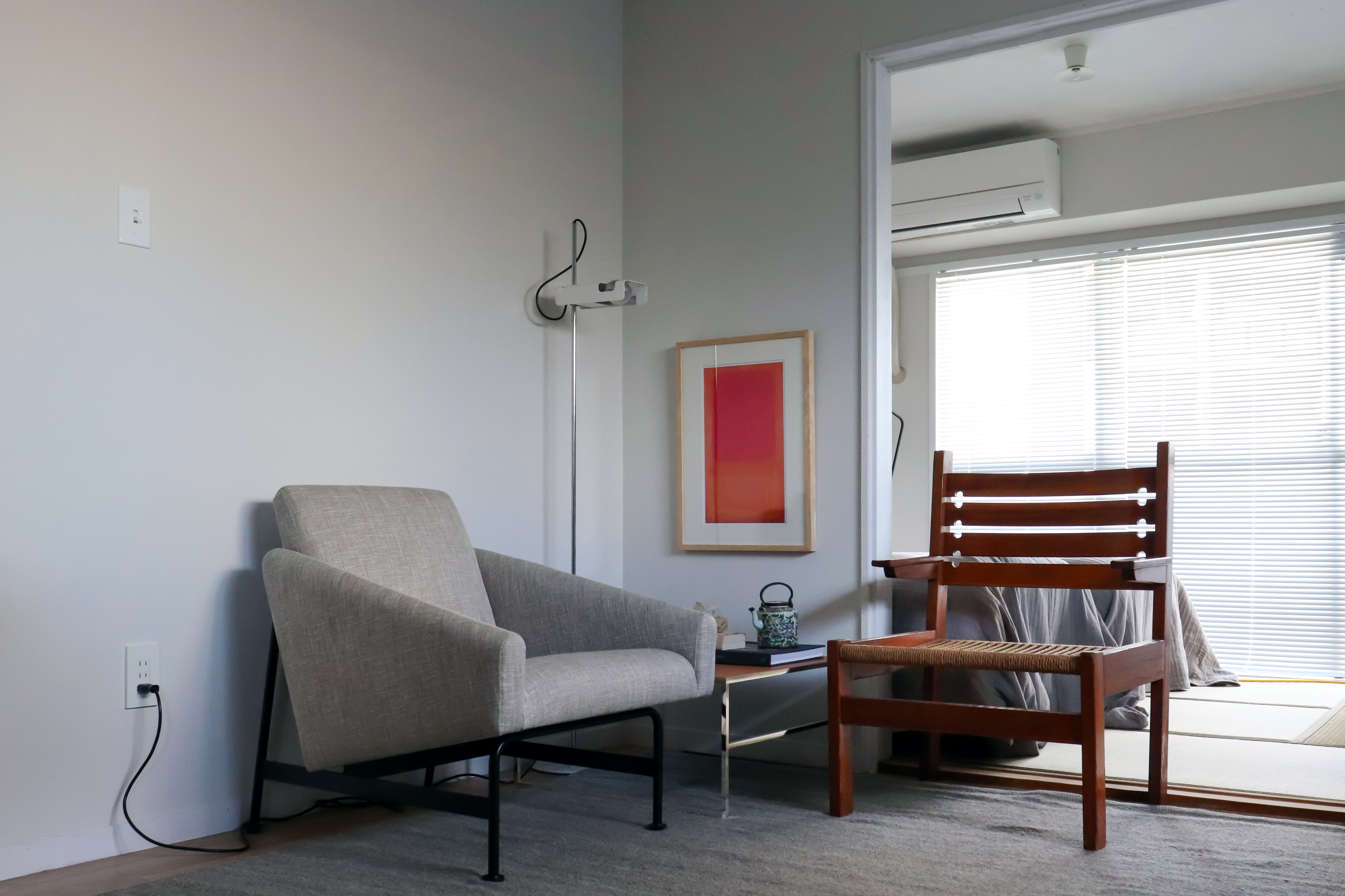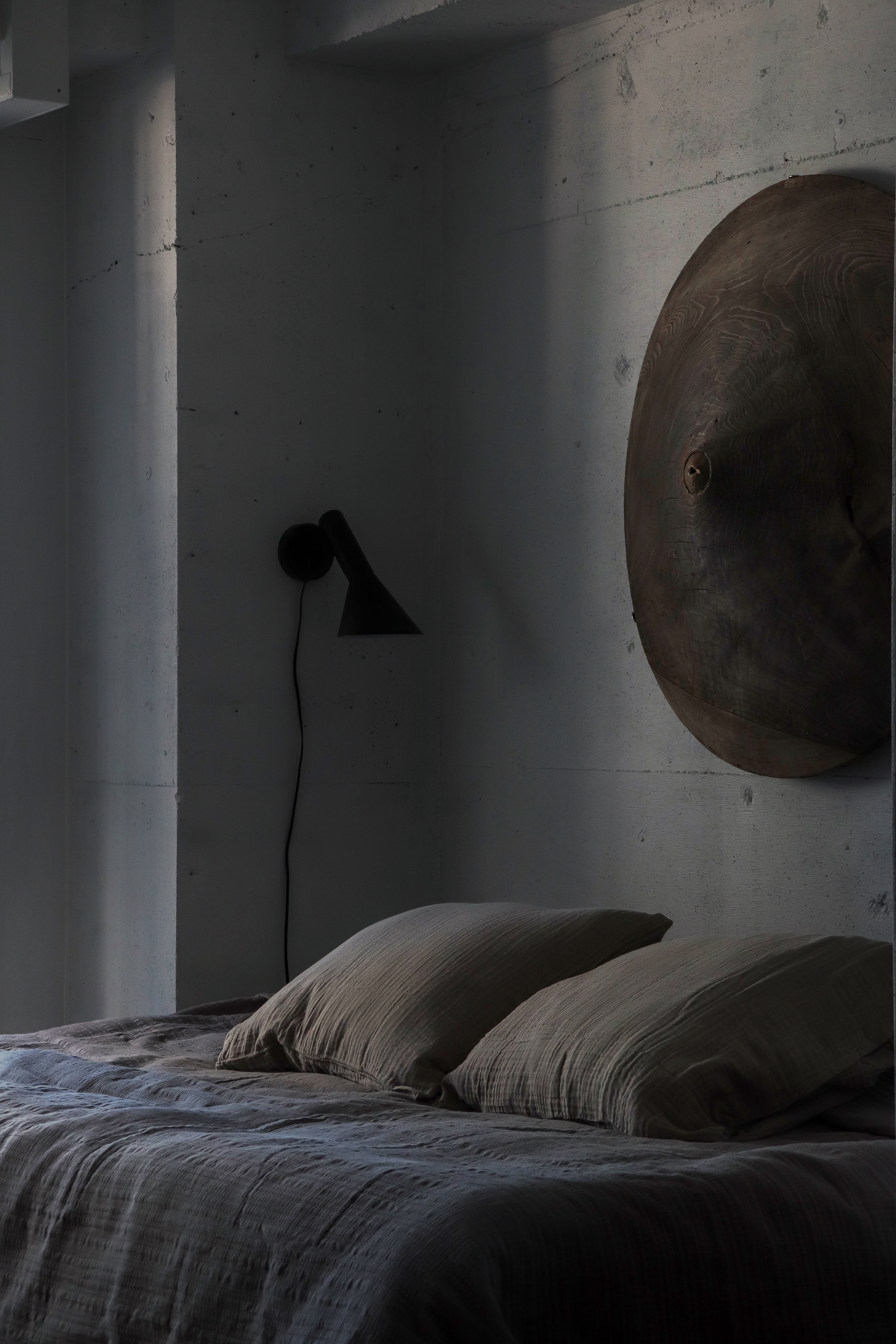 北向きの寝室は静謐としており、壁に掛けられた胡桃染和紙の作品と古い笠の木型のオブジェが、手触りのある日本の歴史を感じさせます。